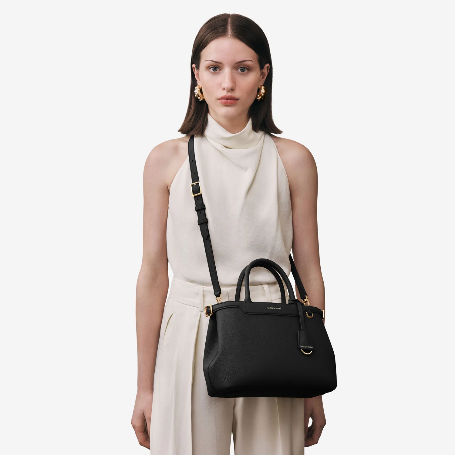A flagship creation celebrating eight years of MAISON de SABRÉ craftsmanship, The Medium Palais embodies nine iconic brand codes handcrafted in supple calf leather that softens beautifully over time. Its fluid silhouette transports you seamlessly from brunch to gala, with adjustable belting, a secure bridge clip, rolled leather handles, a detachable crossbody strap, and contrast-hued natural suede leather lining exposed at the characteristic sideseam. A generous interior stows an iPhone 16 Pro Max, pouches, a water bottle and daily essentials without compromising form. A SABRÉMOJI™ Charm Link allows for personalisation through signature Charms, while its elegant presence — a smaller sibling to The Large Palais — empowers every ensemble.Â