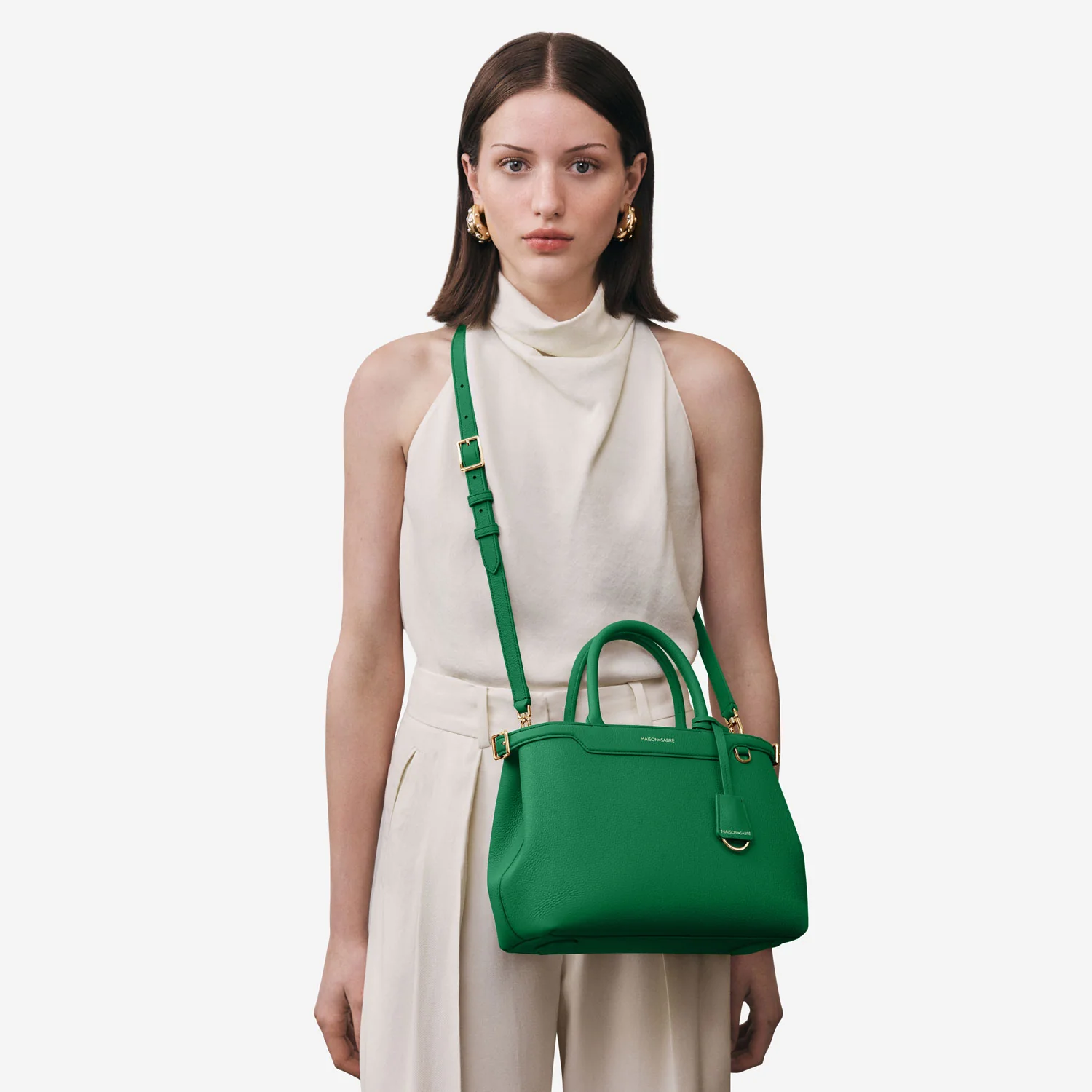 A flagship creation celebrating eight years of MAISON de SABRÉ craftsmanship, The Medium Palais embodies nine iconic brand codes handcrafted in supple calf leather that softens beautifully over time. Its fluid silhouette transports you seamlessly from brunch to gala, with adjustable belting, a secure bridge clip, rolled leather handles, a detachable crossbody strap, and contrast-hued natural suede leather lining exposed at the characteristic sideseam. A generous interior stows an iPhone 16 Pro Max, pouches, a water bottle and daily essentials without compromising form. A SABRÉMOJI™ Charm Link allows for personalisation through signature Charms, while its elegant presence — a smaller sibling to The Large Palais — empowers every ensemble.Â